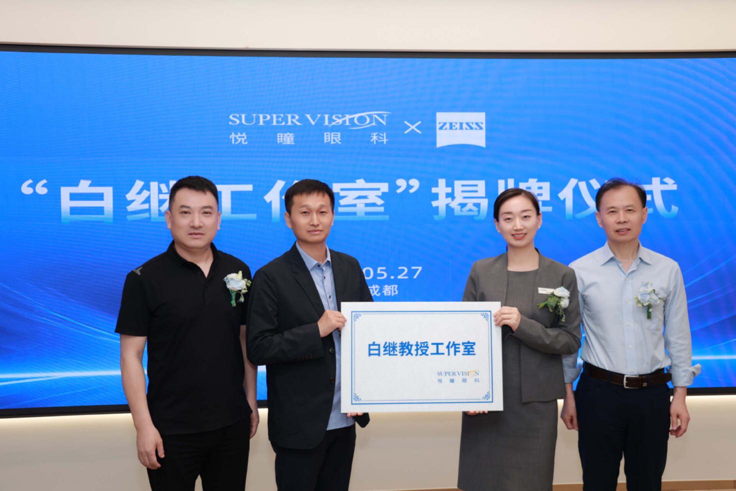 成都悦瞳眼科医院代表(左)为“白继教授工作室”揭牌