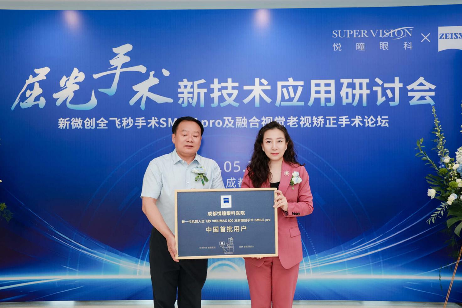 论坛现场,蔡司屈光全国患教支持经理潘泽女士、蔡司医疗眼科川藏业务负责人童小乔女士为成都悦瞳眼科医院授予“新一代机器人全飞秒VISUMAX800及新微创手术SMILEpro中国首批用户”“新一代机器人全飞秒VISUMAX800及新微创手术SMILEpro临床合作单位”荣誉称号,以此充分肯定成都悦瞳眼科医院在屈光手术技术应用领域的领先地位。