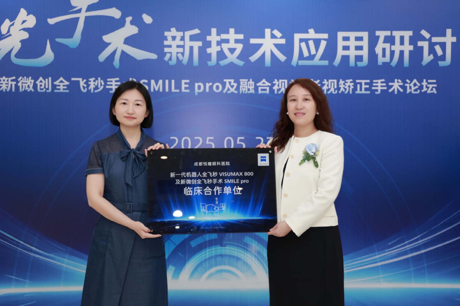 蔡司医疗眼科川藏业务负责人童小乔女士(右)向成都悦瞳眼科医院屈光科主任陈星教授(左)颁发授牌