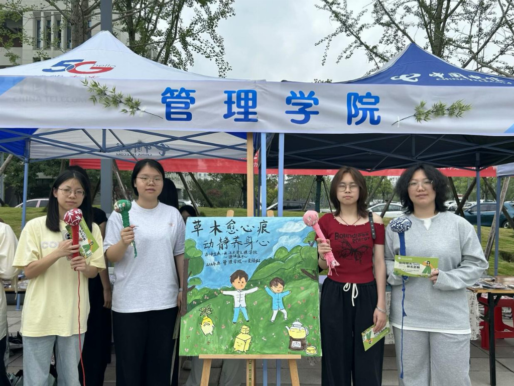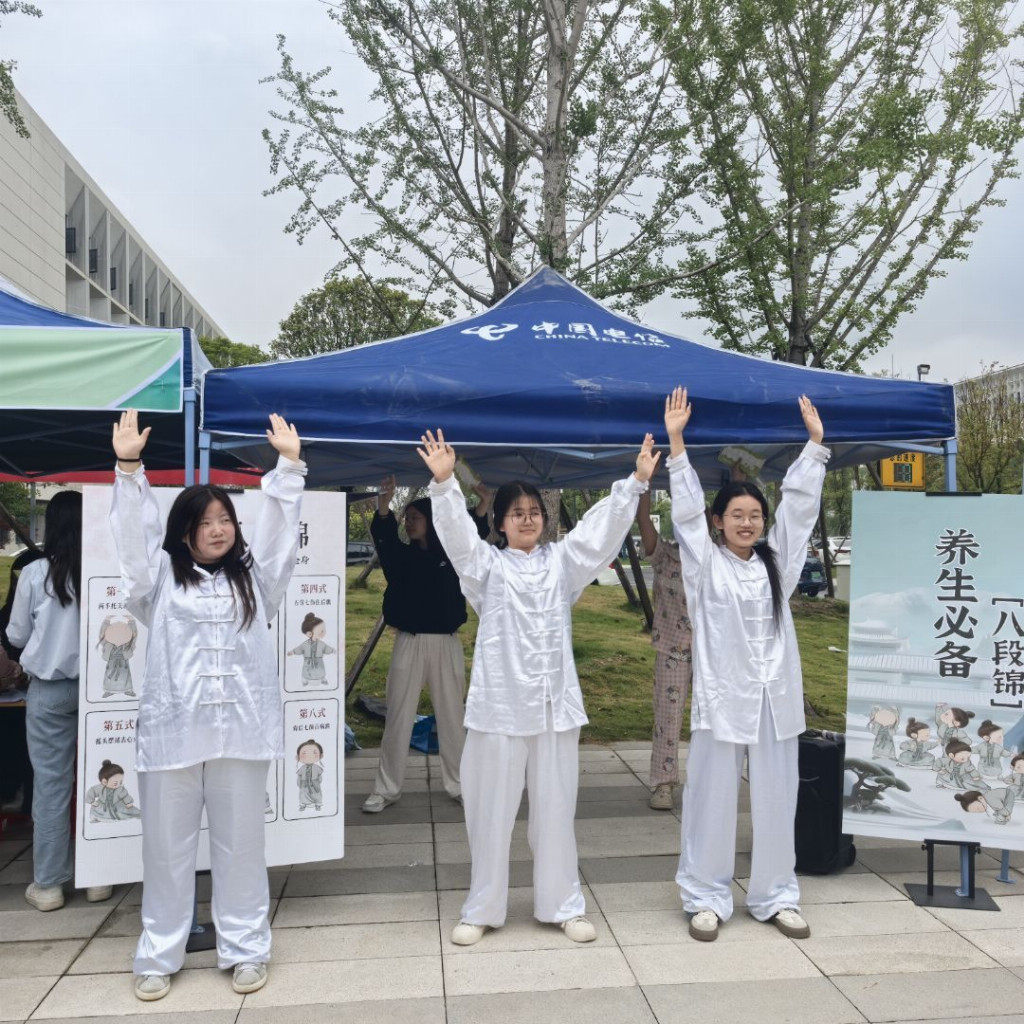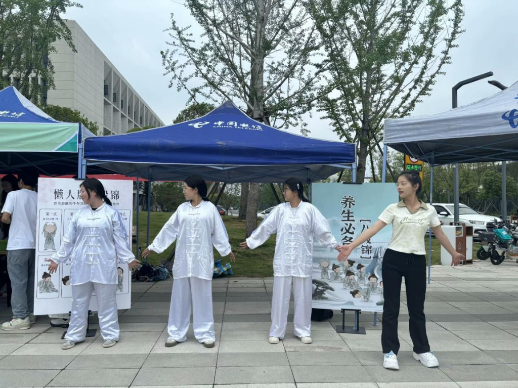 活动现场,精心设计的印章打卡机制串联起多个趣味体验区,学生们手持集章卡穿梭其中,兴致盎然。动静相宜的八段锦体验区人气十足。在工作人员的带领下,同学们凝神屏息,一招一式认真模仿——从舒展流畅的起势到沉稳优雅的收势,动作虽初学略显生涩,但那份专注与投入清晰可见。柔和的肢体伸展间,压力仿佛随之释放。“练完感觉身体放松了,心里也平静不少”,一位参与者边擦汗边笑着说,大家在强身健体之余,真切感受到了传统养生文化的魅力。