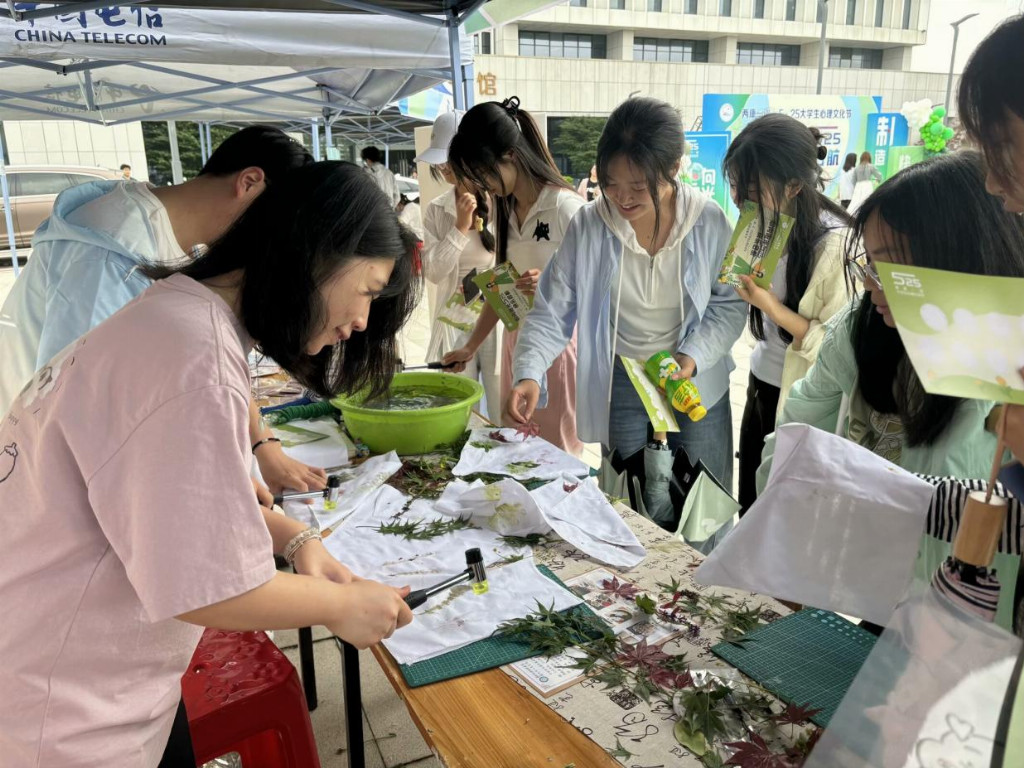 植物拓印体验区则弥漫着自然的气息与创造的乐趣。在专业指导下,同学们精心挑选形态各异的叶片花草,细心铺陈在棉布上,随后用小锤专注地敲打。清脆的敲击声中,植物的脉络、色彩被清晰地拓印下来,一幅幅独一无二的自然画作跃然布上。这不仅是动手实践,更是一次生动的自然美育与劳动教育融合课,学生们在创作中感受着自然的疗愈力量。