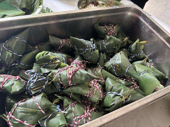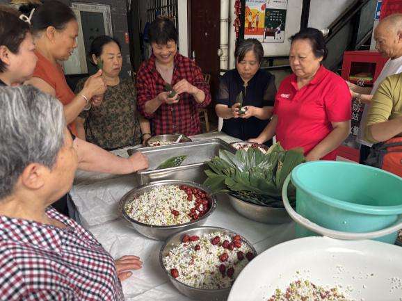 活动当天,社区工作人员特地邀请社区内粽子达人化身 “老师”,提前准备好糯米、粽叶、红枣、红豆等食材,耐心地为居民们示范包粽子的技巧。从粽叶的折叠、馅料的填充,到绑绳的方法,每一个步骤都讲解得细致入微。居民们围坐在一起,认真学习,相互交流,互帮互助,现场欢声笑语不断。大家包出的粽子形态各异,却都饱含着浓浓的情谊。最后,居民们捧着亲手包制的粽子在打卡板前合影留念,记录下这一美好时刻。据统计,本次活动共包制粽子 100 余个。