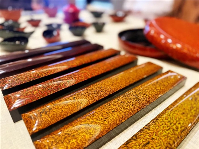 活动现场陈列了明清风格苏作家具及脱胎漆器珍品,嘉宾们近距离观赏了范雪坤老师带来的明式直杆玫瑰椅、脱胎漆器捧盒等珍品。其中还有范雪坤老师三年磨一剑精心制作的红色脱胎捧盒,漆面色彩经典红黑搭配,天地盖与子母口:盒盖与盒身严丝合缝,领略了匠人“一生择一事”的坚守与智慧。