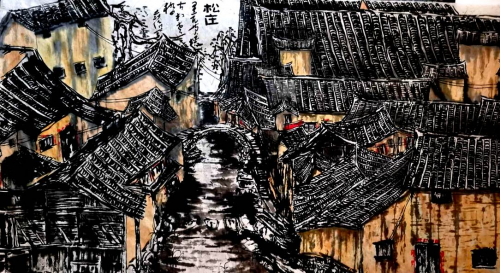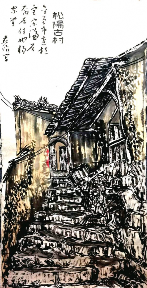 松庄村位于三都乡的西南边,是个典型的高山傍水古村落,地处崇山峻岭的山坳之中,九山半水半分田,水口茂盛的林木遮掩着村落,从狭窄的路口进入,立即豁然贯通。一段断瓦残墙护住的旧门框,正如一个自然的取景框,框后是大片如波浪般的黑瓦和黄墙。五尺坑的孱孱流水呈“S”形绕村而过,泥墙青瓦依山傍水而建,远远望去,呈现出一幅立体的“小桥流水人家”画卷。然而村民告诉我们,由于上游正在修建水库,所以溪流的水既小且黄,很是抹煞了以水美闻名的松庄,不过这仍不妨碍数只在溪中嘻戏觅食的水鸭。