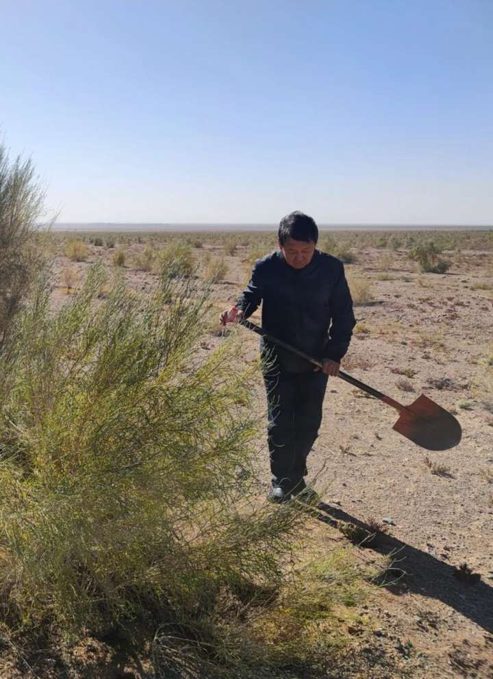 最初以放牧为生的他,禁牧后,跟随进城谋生的“潮流”,打过工、开过小食堂。2012年挂念家乡的他,成为嘎查里第一个参与梭梭种植项目的牧民,并在自己的草场种了巴彦乌拉嘎查首批梭梭。