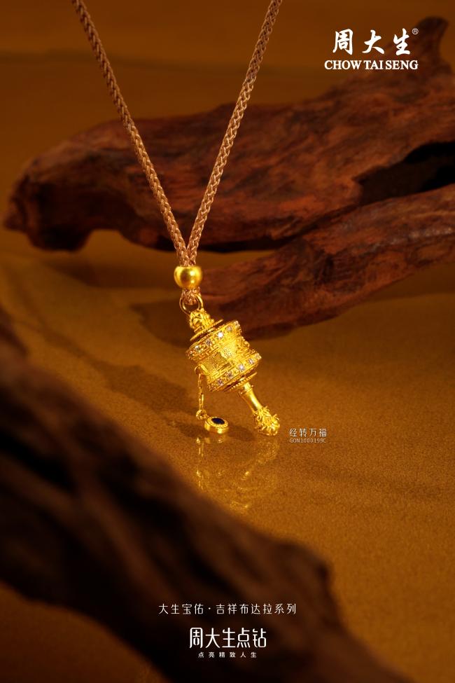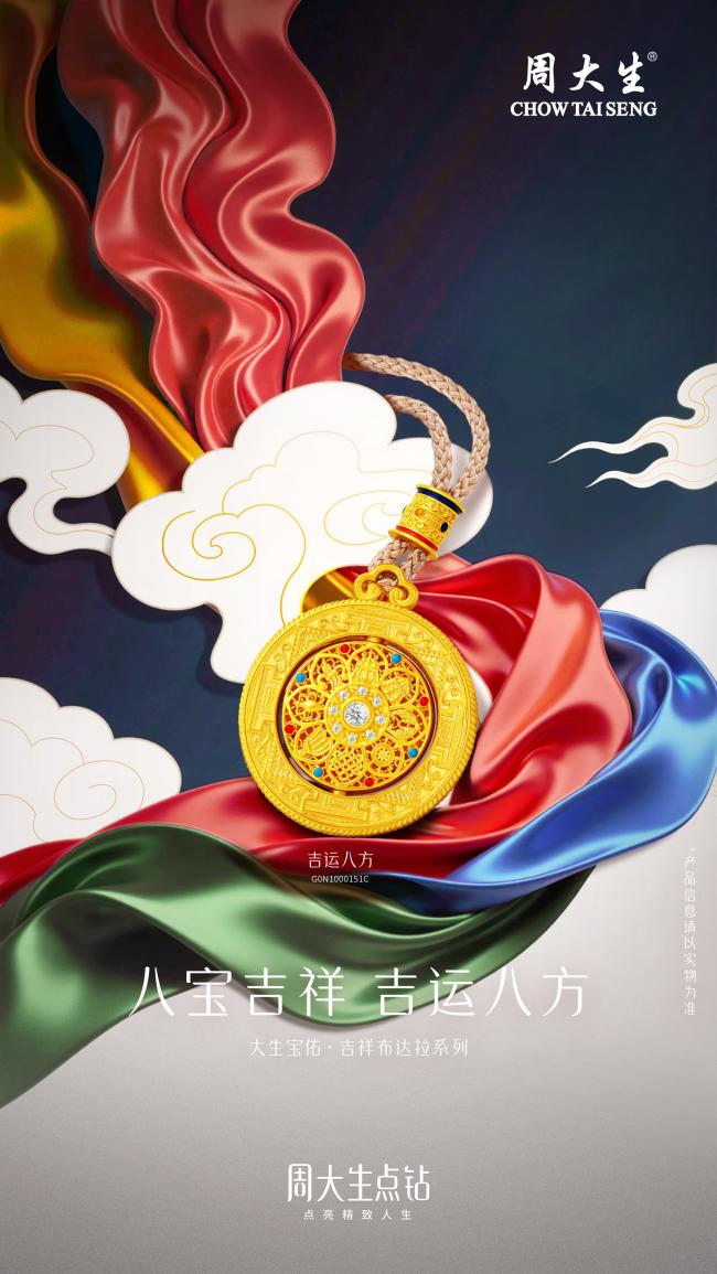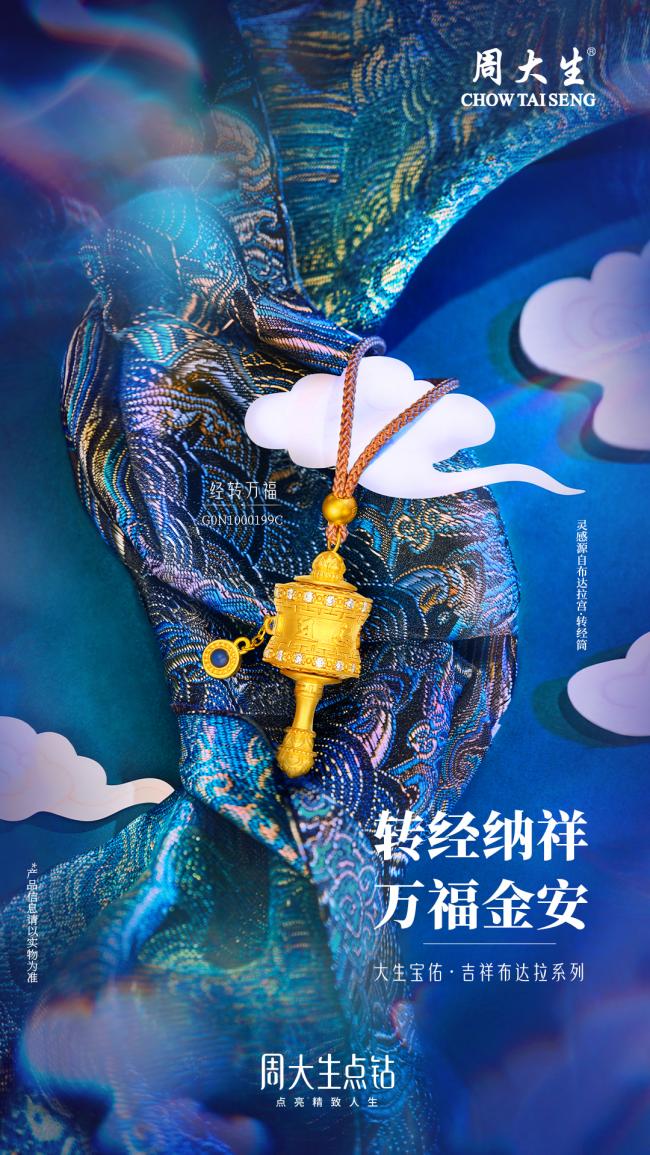 吉祥寓意:八宝守护,祈愿人生坦途宝伞遮风雨,金鱼渡迷津,宝瓶聚福泽……藏地信仰中,吉祥八宝承载着对美满生活的期盼。周大生将这八种最古老的祝福,錾刻成颈间的日月星辰,护你此生路路皆坦途。这份祝福成为跨越时空的纽带——情比金坚,可抵岁月漫长;福佑如经轮,流转生生世世。未来,周大生还将融入唐卡艺术、建筑色谱等更多藏地元素,继续以“密宗符号”为灵感进行产研升级,持续打造福佑文化珠宝的标杆之作。周大生始终致力于传统文化的创新传承。此次大生宝佑·吉祥布达拉系列新品发布,以 “福佑 IP” 为核心文化基底,深度挖掘布达拉宫的吉祥元素,让黄金成为承载美好祝福的文化方舟。当藏地古老祝福以器物形制凝萃千年意蕴,当转经筒的神圣辉光透过现代工艺,化作贵金属的流转韵律,佩戴者自与千年文明达成精神的同频共鸣——这既是文化的觉醒,亦是福佑文化的延续。