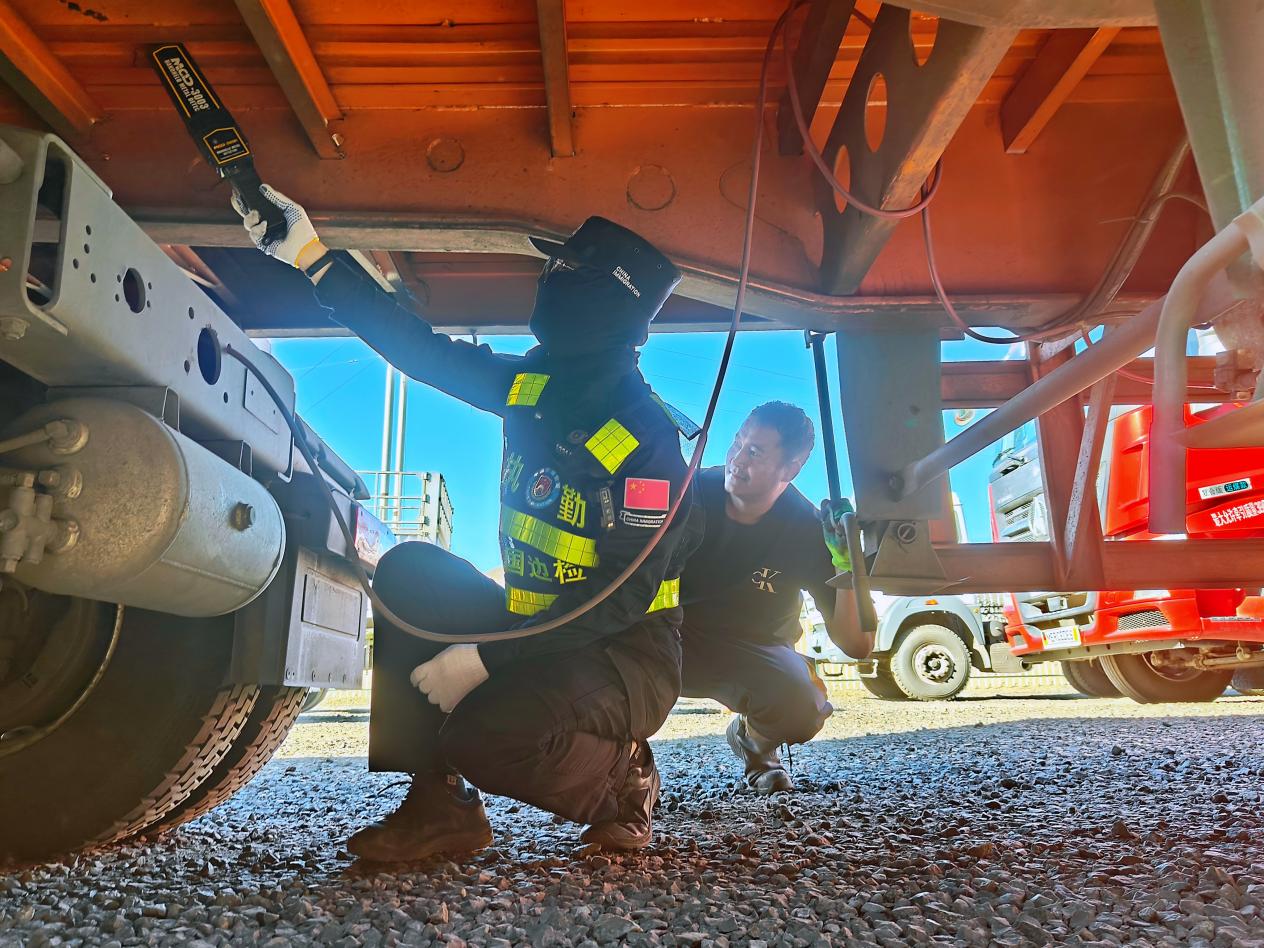 为严格落实车体100%检查要求,民警们需要在这种环境下,每天重复着上百次的工作流程,每当车辆驶入查验区,他们便迅速上前,熟练地引导车辆停靠到指定位置。打开驾驶室车门,仔细检查内部空间;俯身弯腰,手持金属探测仪,探头仔细查看车底是否存在异常;货车刚停下时,金属车体被晒得滚烫,靠近时热浪裹挟着刺鼻的气味扑面而来,可民警们顾不上这些,他们的眼神专注而坚定,不放过任何一处细节。