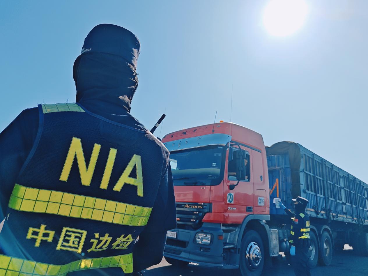 塔克什肯出入境边防检查站执勤民警正在对入境货车进行安全检查 李贵升|摄