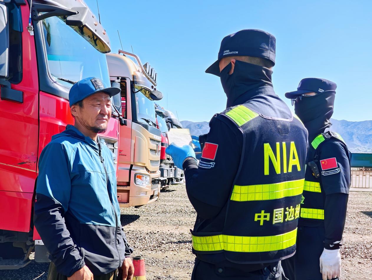 塔克什肯出入境边防检查站执勤民警正在对出境货车进行证件检查。林常柏|摄