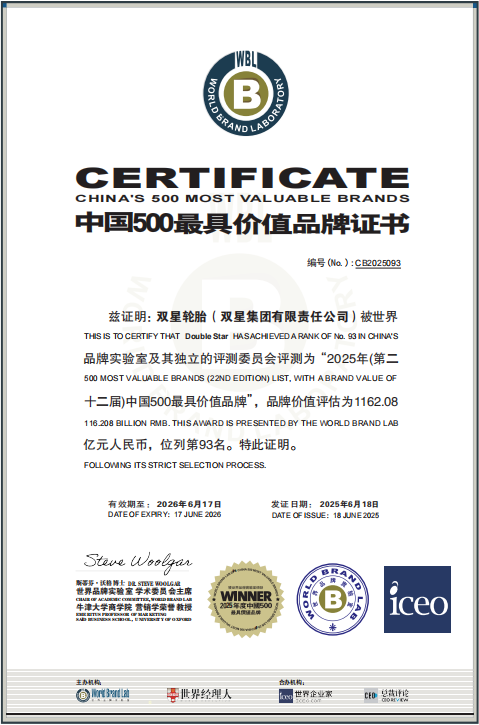连续多年以行业第一入选“中国500最具价值品牌”,汇聚着用户、社会、行业专家的认可与信任,双星将持续深化品牌建设,提供更安全、更智能、更环保的轮胎产品,不断提升用户体验,以扎实的行动推动品牌价值持续增长,为中国轮胎行业的高质量发展贡献力量。