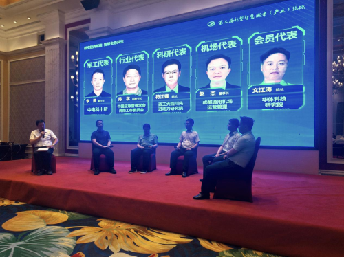 中国科学院大学博士生导师天府学者杨凡主持,军工代表中电科十所李勇副主任,行业代表中国应急管理学会消防工作委员会陈学副秘书长,科研代表西工大四川先进动力研究院符江锋院长,机场代表成都通用机场运营管理有限责任公司赵杰董事长,会员代表华体科技文江涛院长,围绕“低空经济会给智慧城市带来什么机遇”进行了专题论道。