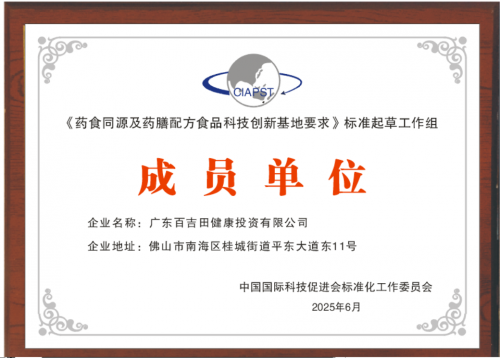 随着健康中国战略深入实施,药食同源理念日益普及,市场对融合传统智慧与现代科技的健康食品需求持续增长。为推动行业向科技化、标准化、规范化高质量发展,“药食同源及药膳配方食品科技创新基地要求”团体标准制定工作正式启动。近日,经中国国际科技促进会标准化工作委员会严格审定,广东百吉田健康投资有限公司正式成为《药食同源及药膳配方食品科技创新基地要求》标准起草工作组成员单位。这一重要身份的确立,标志着百吉田在药食同源健康产业的地位与专业贡献获得权威的高度认可。