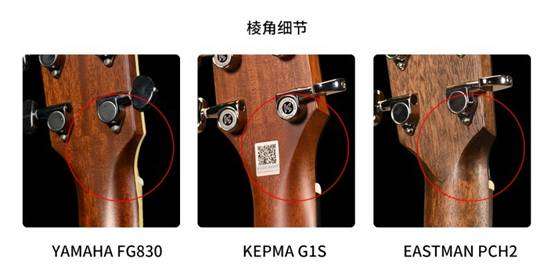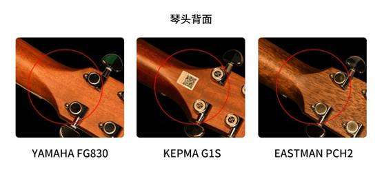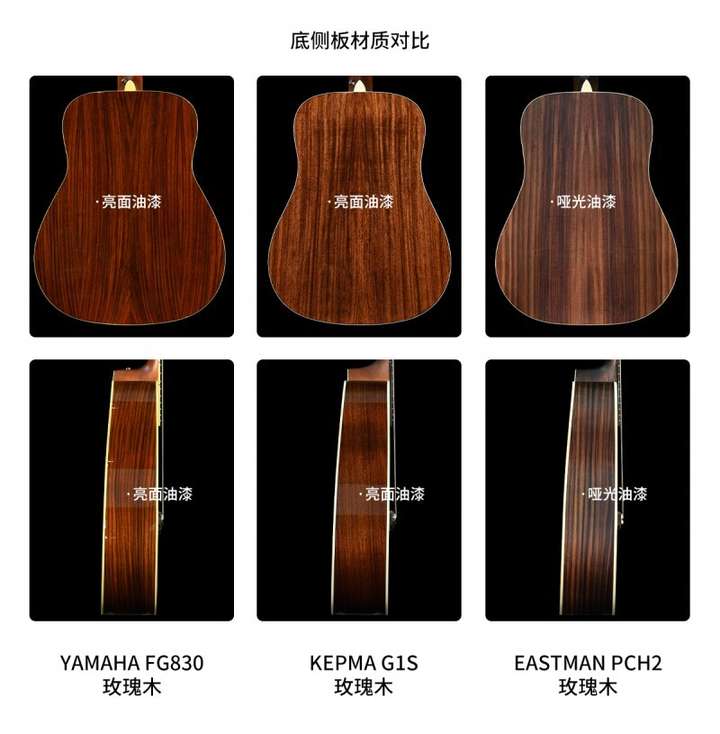 玫瑰木的背侧板也是三家共同的选择,不同的是,YAMAHA和卡普马选择了亮光油漆,Eastman使用的哑光油漆,在成本上相对更低。