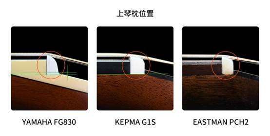在上图中可以看出,Eastman PCH2和卡普马在琴枕安装工艺上相似,但在细节处理上,存在漏胶、毛边的情况,相比之下卡普马更胜一筹,而YAMAHA FG830的弦枕则完全不在指板与琴柄相交的延长线上,且粘合处留缝较宽。