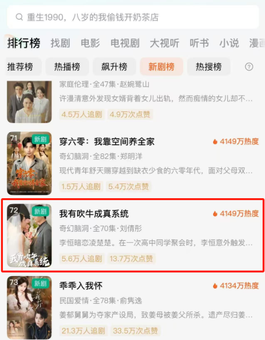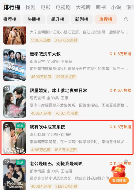 若鸿文化的“爆款制造机”特质不仅体现在短期爆发力,更在于热度的持久性。旗下爆款短剧《我有吹牛成真系统》虽已上线多日,热度却依旧强劲,同时跻身红果热搜榜与新剧榜,双榜点赞数均突破10万。