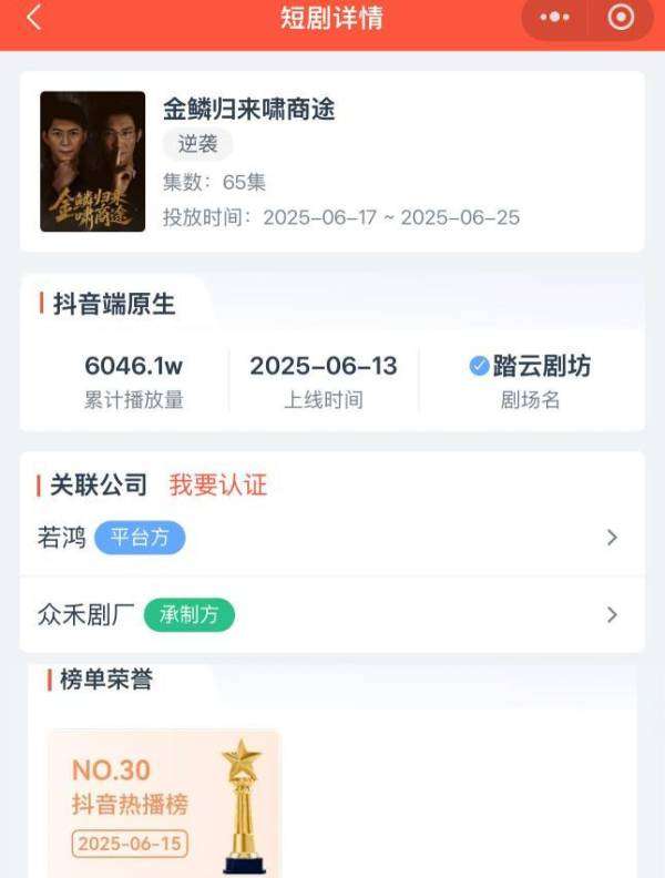 6月13日,若鸿文化都市新剧《金鳞归来啸商途》空降各大平台。该剧在抖音端原生累计播放量迅速突破6000万,稳居抖音热播榜。这部以“都市+逆袭”为核心卖点的作品,一上线便以黑马姿态搅动短剧市场。