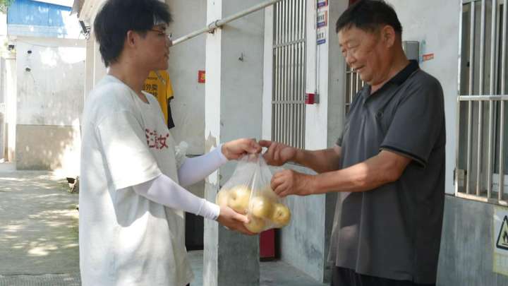 7月4日清晨,实践团走进寿县众兴镇黄圩敬老院,开展“青春暖夕阳”主题活动。团队成员携带梨子、牛奶等物资,细致关怀老人生活。一位男成员轻声叮嘱:“天气热,您要注意防暑!”庭院里,成员们为老人们修剪指甲、播放戏曲,手持梨袋逐一递送时,老人接过袋子的双手与成员的笑容交织成温情画面。“爷爷,梨子润喉”“奶奶,可甜啦”的对话让敬老院洋溢着暖意。