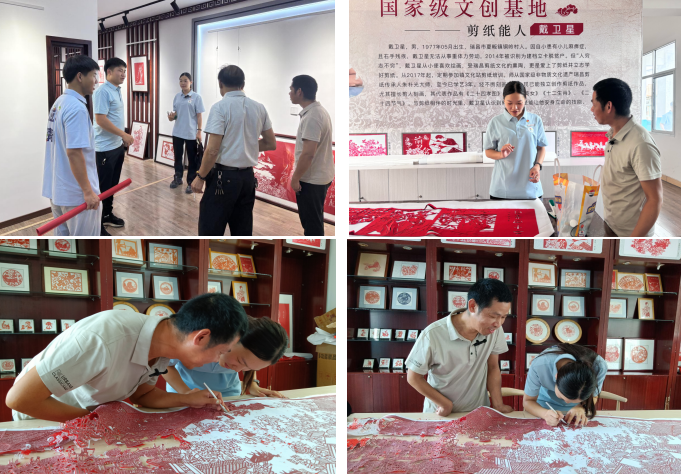 2025年7月1日,在九江瑞昌国家级残疾人文创基地,我们与陈馆长、残疾剪纸传承人戴卫星老师交流。戴卫星老师自幼右手残疾,师从朱朴光大师,深耕剪纸七年,代表作《二十四孝图》等融合传统与现代风格。他在工作区手把手指导学生剪纸,从工具选择到刻刀技巧悉心传授,学生们成功刻出油纸伞图案。