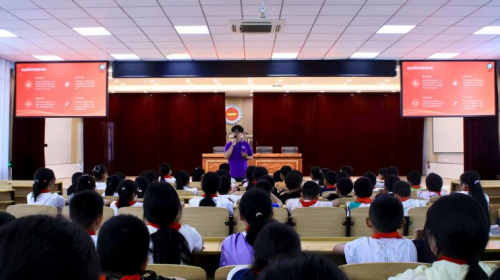 当日下午,团队走进队长葛志琦的母校——阜宁县北沙中心小学,为四年级学生带来“红色盐城·历史印记与精神传承”主题讲座。成员们用博物馆文物图片、纪念碑故事视频等素材,通过讲述“盐城的历史渊源”“新四军在盐城的革命历程”“盐阜军民的抗战贡献”“盐城的水利与劳动记忆”“红色基因的当代传承”五个部分,引导孩子们理解历史背后的精神内涵。