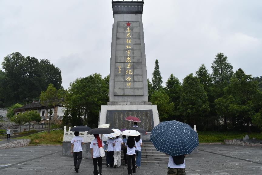 蒙蒙细雨斜斜地织着,打湿了高虎脑红军烈士纪念碑的碑身,杨尚昆同志题写的碑名在雨雾中若隐若现,仿佛蒙上了一层淡淡的哀愁。细密的雨丝顺着碑体缓缓滑落,像是无声的泪滴,将缅怀先烈的哀伤之情轻轻晕染开来,每一滴雨水都似在诉说着那段岁月的沉重与悲壮。