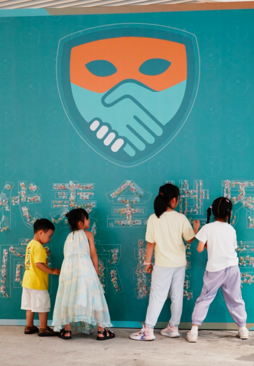 这次所有面具皆为孤品:部分由儿童亲手绘制,天真烂漫;部分由青年艺术家手绘,用色灵动;还有特邀青年书法家黄少杰先生书写的“我是___,代表全世界,向你握手”句式,为每个人保留真实身份。