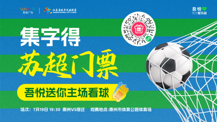 参与方式: 市民可通过参与“集字赢门票”线上互动游戏获,即有机会赢取2025年7月19日(星期六)在泰州主场举行的“泰州 VS 宿迁”苏超联赛焦点战门票。