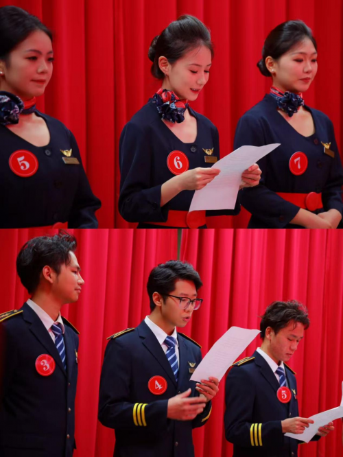 随后,同学们抽取中英文广播词进行朗读,这一环节不仅考验英语发音、语调,还检验对航空专业术语的掌握程度。