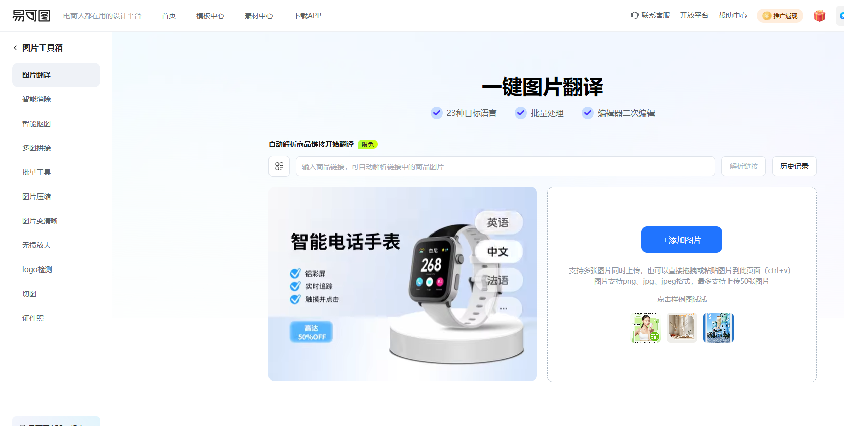 1、上传图片:前往易可图官网,选择【图片工具箱】或【跨境工具箱】,进入【图片翻译】,点击【添加图片】,上传需要翻译的图片(支持多张图片同时上传,最多50张;图片支持png、jpg、jpeg格式)。