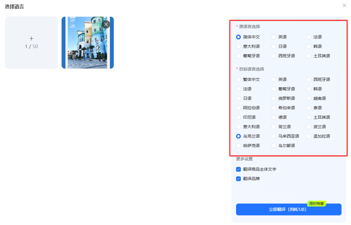 2、原语言选择:选择原始图片中文字的语言。例如,若上传的图片文字是简体中文,就选择简体中文。