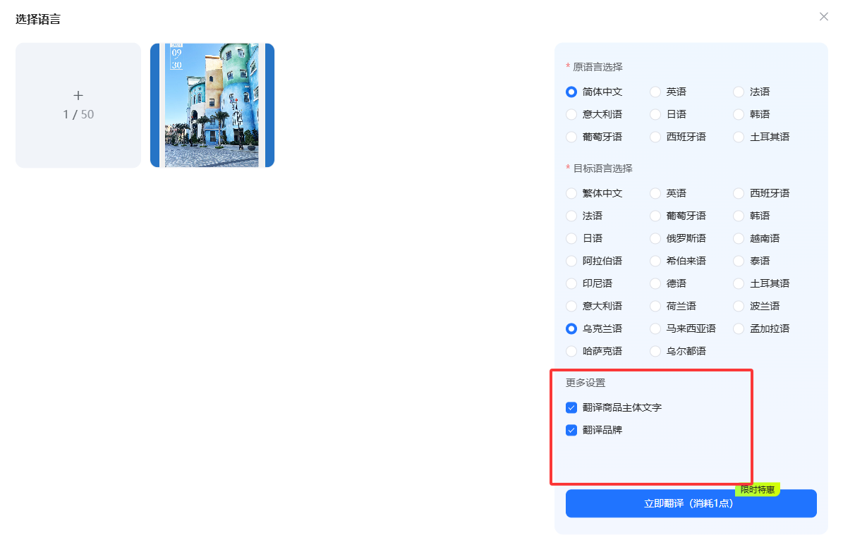 4、更多设置:该设置包含 “翻译商品主体文字” 和 “翻译品牌” 两个选项,根据实际翻译需求勾选或不勾选。