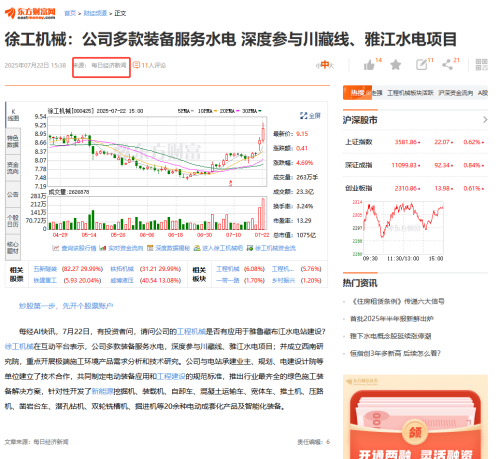 7月22日14时39分,有投资者在网络互动平台询问徐工机械的工程机械装备是否应用于雅鲁藏布江水电站建设,徐工机械于15时15分回应:作为中国工程机械行业的领军企业,公司多款装备服务水电,深度参与川藏线、雅江水电项目。