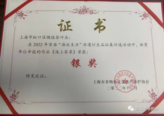 2022年南山爷爷品牌推出的文创礼盒“海上茶票”被授予了“上海礼物”称号。同时,这款“海上茶票”礼盒,也在2022年首届“海派生活”非遗衍生品征集评选中喜获银奖。
