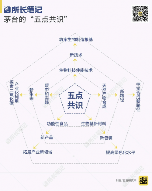 通过广泛的调研,茅台在生物科技发展方向上逐渐形成“五点共识”,包括围绕生物科技使能技术筑牢生物制造根基、围绕天然产物挖掘合成新路径、围绕新材料提高绿色化水平、围绕功能性食品拓展产业新领域、围绕碳中和探索二氧化碳产业化利用。