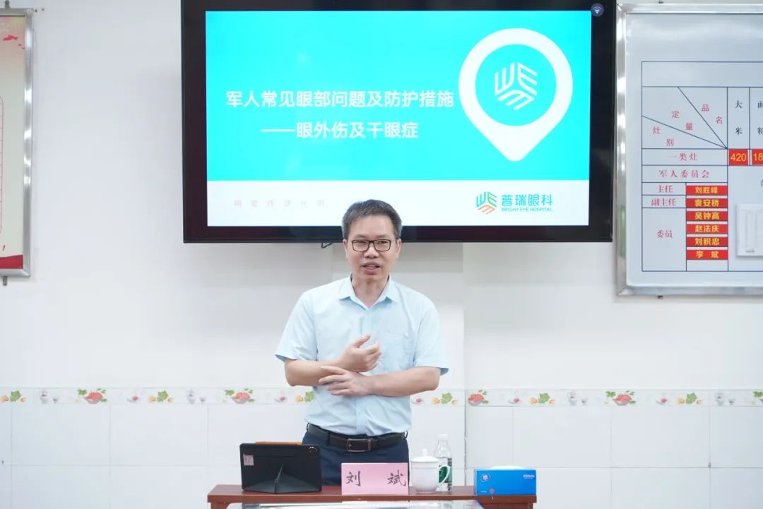 为庆祝中国人民解放军建军98周年,表达对广大默默守护万家灯火安宁的武警官兵的敬意与关怀,普瑞眼科医院集团20周年开展光明系列活动。2025年7月24日,番禺普瑞眼科医院院长刘斌、执行院长李勇俊、眼健康教育部主任林媛、党支部书记杨驰携医护团队走进武警中队,为最可爱的人送上眼健康服务并开展科普讲座。