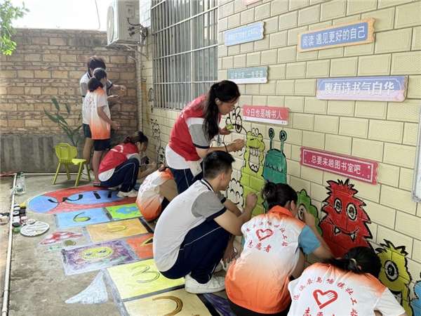 “老师,这个怪兽的牙齿要画得尖尖的!”塘沟村 “童学图书室” 旁的墙下,小朋友们围着队员们七嘴八舌提建议。突击队正在这里开展文化墙绘活动,让老旧墙面实现 “华丽变身”。