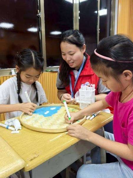 此外,簸箕绘画活动同样精彩纷呈。队员们备好颜料与竹簸箕,引导小朋友们将乡村风光、民俗故事画于其上。有的小朋友画出荔枝满枝的景象,有的描绘舞狮的热闹,有的则把突击队教的安全口诀画成连环画。这些带着乡土气息的作品,成了村里最美的装饰,也让艺术的种子在童心中萌芽。