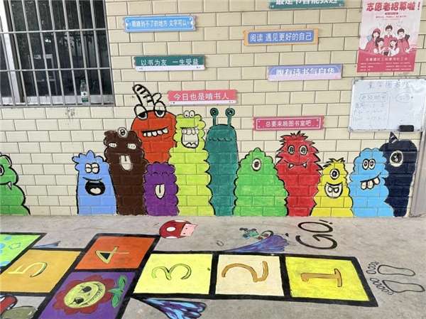墙绘选址紧邻图书室,设计巧妙融合知识性与趣味性:主体是 11 只形态各异的卡通怪兽,或搞怪或呆萌,瞬间抓住小朋友目光;上方错落排列着 “眼睛到不了的地方 文字可以”“腹有诗书气自华” 等阅读标语,古今智慧交织成浓厚书香氛围;地面绘制的彩色 “跳房子” 图案,更让整个空间成为集观赏、学习、互动于一体的文化乐园。