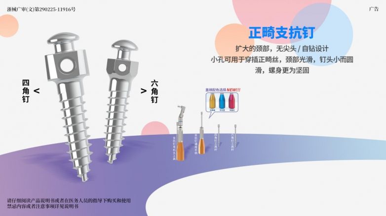 在支抗钉领域,华文提供四角钉与六角钉双形态选择。扩大颈部设计拓展操作空间,圆滑钉头减少黏膜刺激,无尖头结构避免植入断裂。采用抗过敏材质,配合科学螺纹提升固位性,降低二次植入风险。