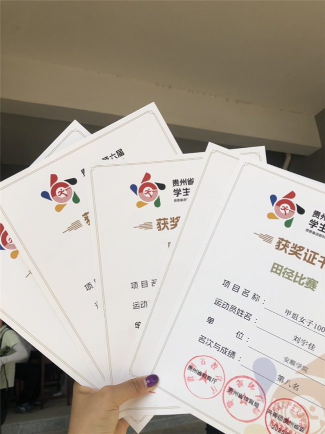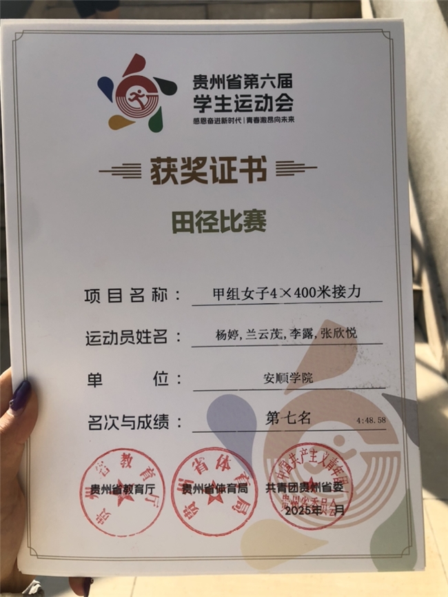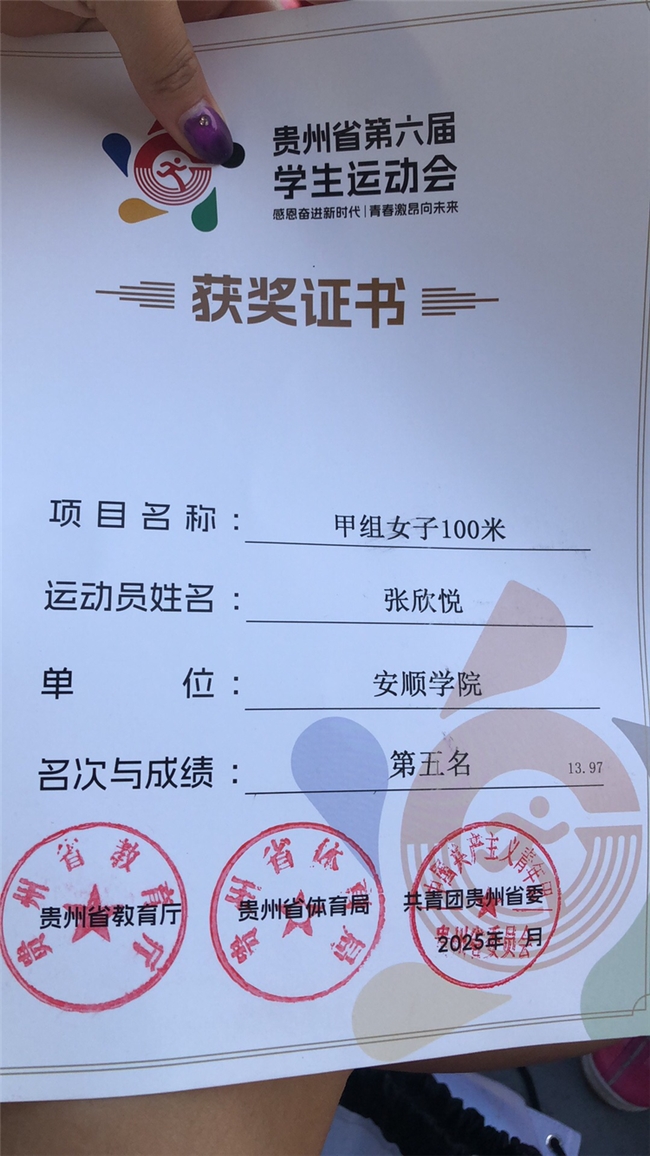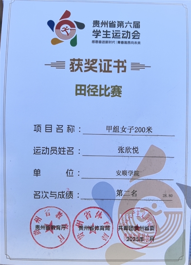 安顺学院·2023级航空服务艺术与管理专业,学⽣张欣悦、刘宇佳、杨星星,代表安顺学院,参加2025年贵州省第六届学生运动会,表现卓越、喜获多项佳绩。
