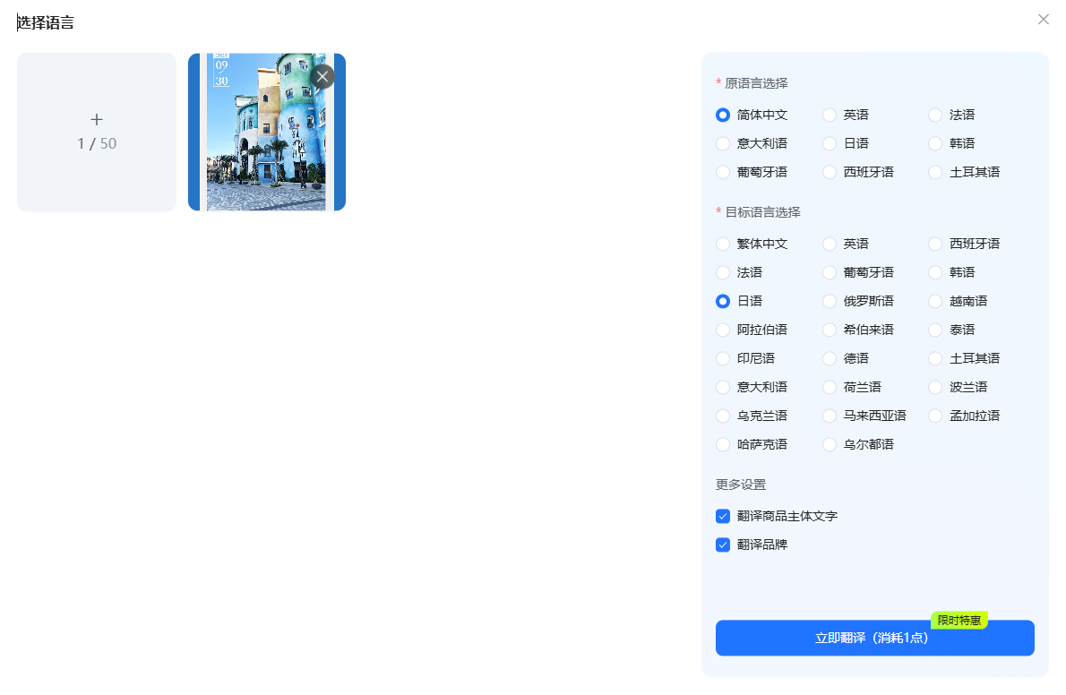 在翻译之前,还可以进行更多设置,包括 “翻译商品主体文字” 和 “翻译品牌” 两个选项。如果只需要翻译商品主体相关的文字,就勾选 “翻译商品主体文字”;如果需要翻译图片中的品牌名称,就勾选 “翻译品牌”,根据实际需求进行选择即可。