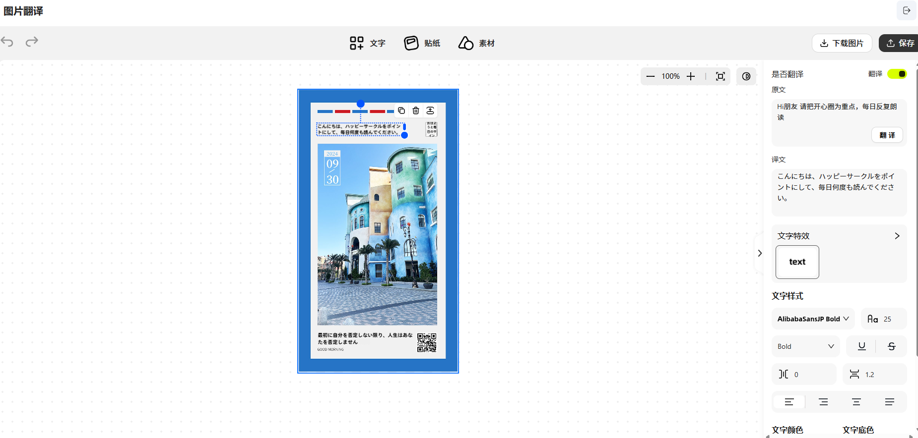 如果对翻译后的文字位置、字体样式、大小、颜色等不满意,可以点击 “手动调整” 按钮进入调整页面。在调整页面,不仅可以对文字的各项属性进行修改,编辑器上方还内置了贴纸素材,可根据需要添加,让翻译后的图片更加美观、符合需求。