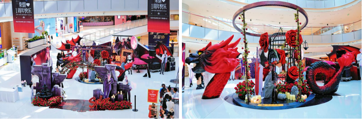 告别传统商业的被动“等人来”,西北区域太原吾悦广场以逆向思维主动“找人去”。瞄准7月国乙次元爆款IP恋与深空-秦彻一周年时间线,打造“深渊乐土 共生之约”主题美陈展,太原吾悦广场精准捕捉次元青年核心需求,巨型痛楼美陈矗立6层中庭,6米长的龙形雕塑,融合国风与次元漫展活动中,限定主题展区设置从秦彻光影互动墙、定制1:1还原游戏场景,顾客可进入装置内进行体验拍照,引发国乙爱好者疯狂围拍。主题美陈日吸引打卡3000+人次,带动6层二次元谷子品牌销售增长30%,客流同比突破新高,社交媒体曝光量突破500万+,成功实现“商业+次元”的破圈融合。