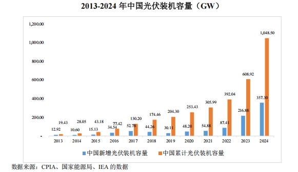 近年来,全球光伏新增装机容量屡创新高,中国作为全球最大的光伏市场和应用国,更是展现出强劲的增长动力。根据CPIA、国家能源局、IEA的数据,2024年我国光伏新增装机容量达357.30GW,自2013年以来我国光伏新增装机容量已连续12年位居世界第一。2024年我国累计光伏装机容量已达1,048.50GW,近10年复合增长率达42.53%,国内光伏装机容量持续保持稳步增长态势。这一庞大的市场需求,为光伏设备行业提供了广阔的发展空间。