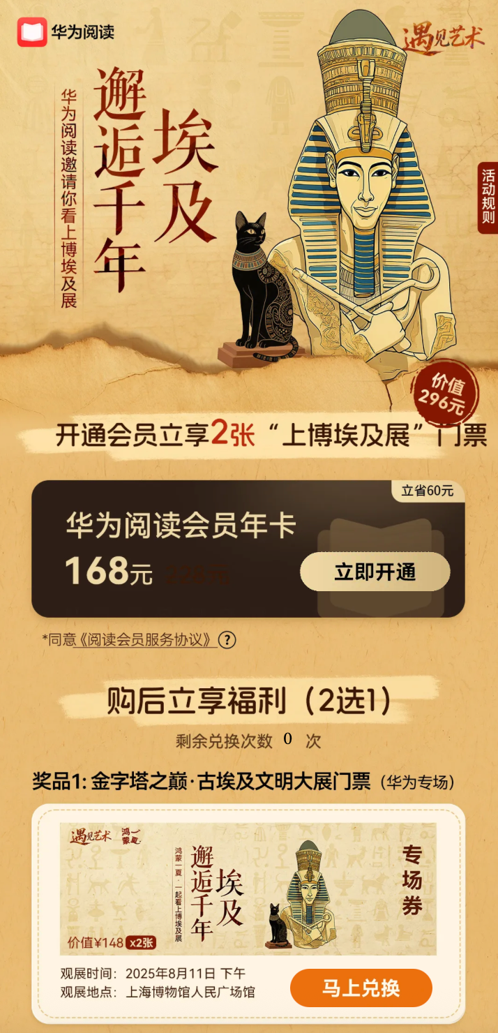 更让我心动的是华为阅读的“宠粉操作”!现在只要购买华为阅读会员年卡,就能直接获赠2张埃及展门票!我手速狂飙冲了年卡——过不了几天就能去看那顶带有谢提二世和塔沃瑟瑞特王后王名的“黄金花冠”!书里的内容照进现实,谁忍得住啊?作为“此生必看”的古埃及大展,8月17日就要撤展,再犹豫真得打飞的去开罗了。