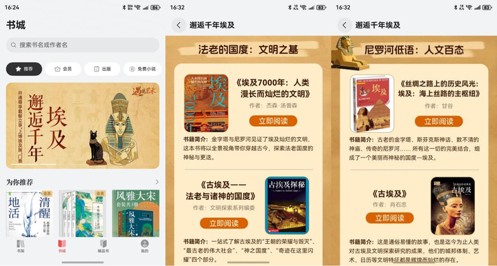 作为一个平时无聊爱看点古国文化内容的伪文青,总喜欢翻翻推荐书单,看看有没有自己感兴趣的。这不,偶然发现了华为阅读上新推了个邂逅千年埃及的专题内容。点开一瞧,好家伙,满满的干货!真是深得我心,赶紧看看怎么个事。