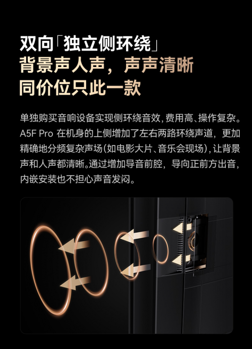 其次,A5F Pro配备了强大的QD-Mini LED背光系统,最高支持1056分区(85英寸),并采用了创维新一代全链路AI光晕控制技术,结合自研的AI画质芯片Pro。这套系统通过深度学习和AI算法,能实时优化画面清晰度、对比度、亮度及精准控制光晕,尤其擅长提升低码率4K内容的实际清晰度表现。在音质方面,A5F Pro革命性地内置4.2声道回音壁,内置12个高品质声学单元,峰值200W。其科学的四面发声设计结合哈曼专业调音,显著拓宽和升高了声场,并创新性地通过独立侧环绕声道设计,实现了无需外接音响也能获得精准分频、层次分明、极具包围感的影院级音效,一举解决了传统电视音质平淡和家庭摆放音响空间受限的痛点。