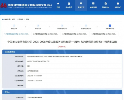 2025年6月10日,中国雄安集团电子招标采购交易平台公示了中国雄安集团有限公司2025-2028年法律服务机构库(第一标段:城市运营法律服务)中标结果。北京市惠诚律师事务所凭借深厚的专业素养与丰富的实践经验,成功入选中国雄安集团有限公司2025-2028年度法律服务机构库,担任中国雄安集团有限公司法律服务供应商,为其提供城市运营法律服务。本次入选代表了中国雄安集团有限公司对惠诚律所综合实力、专业能力的高度认可,充分彰显了惠诚在城市运营业务领域的卓越的能力和在业界的良好口碑。
