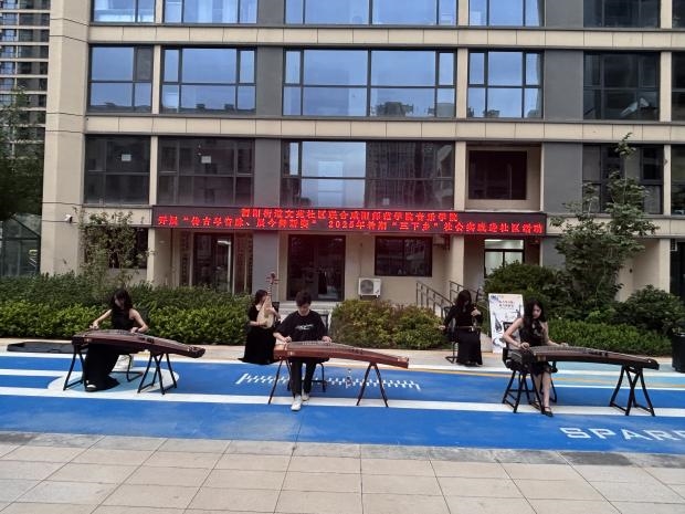 古琴演奏环节,成员们以精湛的技艺演奏了一首首经典曲目。空灵悠远的琴音仿佛将居民们带入了宁静悠远的意境之中,让大家近距离领略到了古琴艺术的雅韵,感受到了中华优秀传统文化的深厚底蕴。“红歌联唱”环节将本次活动推向高潮。实践团成员们与社区老人及孩童们共同演唱《我和我的祖国》等红色经典曲目,嘹亮的歌声唤起大家对革命岁月的深情回忆,激发了浓厚的爱国情怀。现场多位观众自发跟唱,掌声不断,共同呈现了一场别开生面的社区音乐盛会。