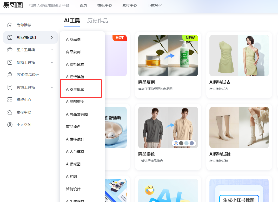 AI 图生视频功能可以在易可图平台的【AI 商拍 / 设计】板块找到入口,其核心能力是根据用户上传的图片和关键词描述,自动生成 5 秒或 10 秒的动态视频。该功能无需专业拍摄设备和剪辑技巧,极大降低了商品视频的制作门槛,让普通电商从业者也能轻松产出具有吸引力的营销内容。
