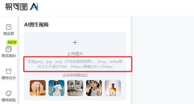 制作 AI 商品视频的第一步是上传图片,这是视频内容的核心基础。需注意以下要求: